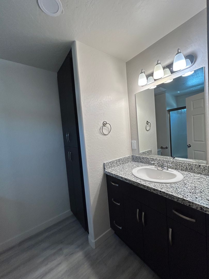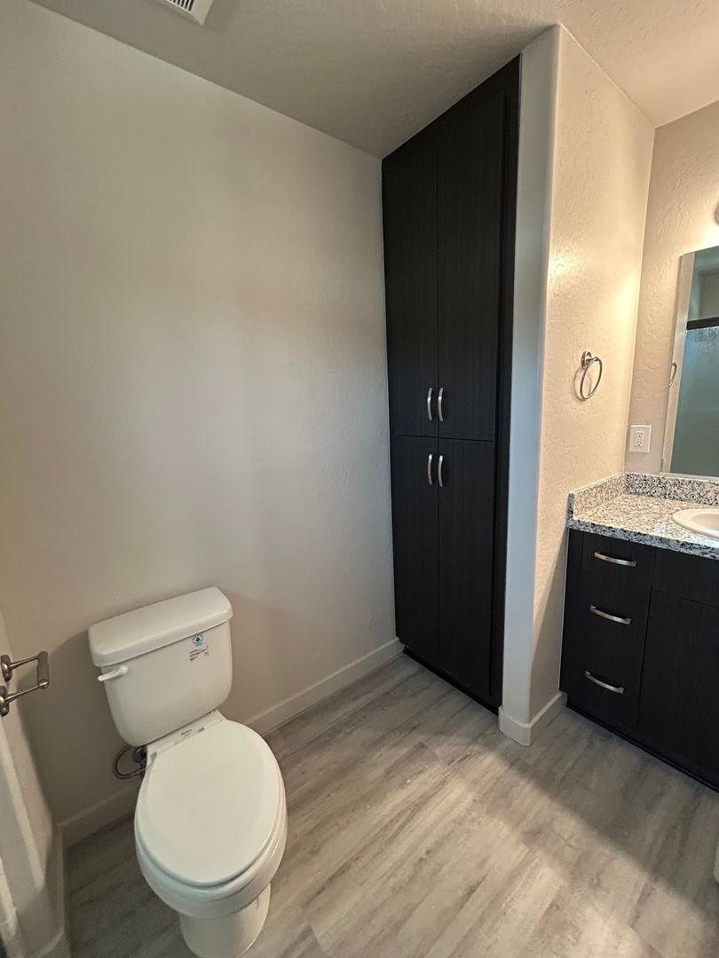 The bathroom features contemporary fixtures and additional storage space. Enjoy the privacy of your own entrance and a dedicated space to call your own.